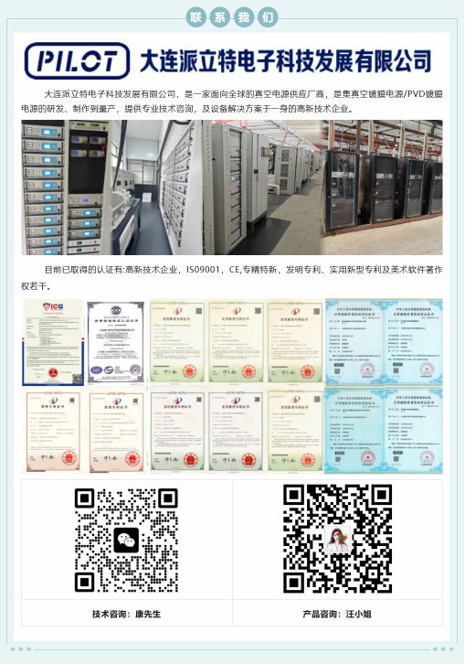 大連派立特電子科技發展有限公司,是一家面向全球的真空電源供應廠商,是集真空鍍膜電源/PVD鍍膜電源的研發、制作到量產,提供專業技術咨詢,及設備解決方案于一身的高新技術企業。 主要在售電源品類如下,已廣泛應用于諸多業內頭部企業并得到高度認可,支持按需定制: 多弧電源 燈絲電源 清洗電源 轟擊電源 靜電吸附電源 脈沖弧電源 中頻濺射電源 脈沖偏壓電源 離子源電源 直流磁控濺射電源 直流脈沖濺射電源 and so on... 目前已取得的認證有:高新技術企業,ISO9001,CE,專精特新,發明專利、實用新型專利及美術、軟件著作權若干。